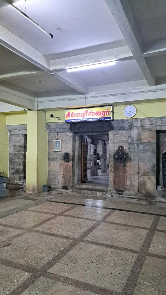 Nestled in the serene stretch of the Karur–Trichy highway, just 6 kilometers from Kulithalai, lies the sacred Karuppathur Simmapureeswarar Temple in Karur District. The presiding deity here is Lord Simmapureeswarar, accompanied by his consort Goddess Sugantha Kundalambigai. This hallowed shrine is believed to be the very place where Lord Narasimha worshipped Lord Shiva to rid himself of the sins incurred after slaying the demon Hiranyakashipu. Originally known as Narasimhapureeswarar, the deity later came to be revered as Simmapureeswarar.