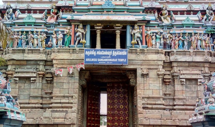 Sprawled across 4 acres, the temple features a majestic five-tier Rajagopuram on its northern side. The presiding deity is Sangameswarar (Lord Shiva) and his consort is Pannaar Mozhiyaal (Vedanayagi Amman). A unique shrine for Lord Kartikeya lies between the sanctums of Shiva and Parvati. There’s also a dedicated shrine for Vishnu and Soundaravalli Thaayar.