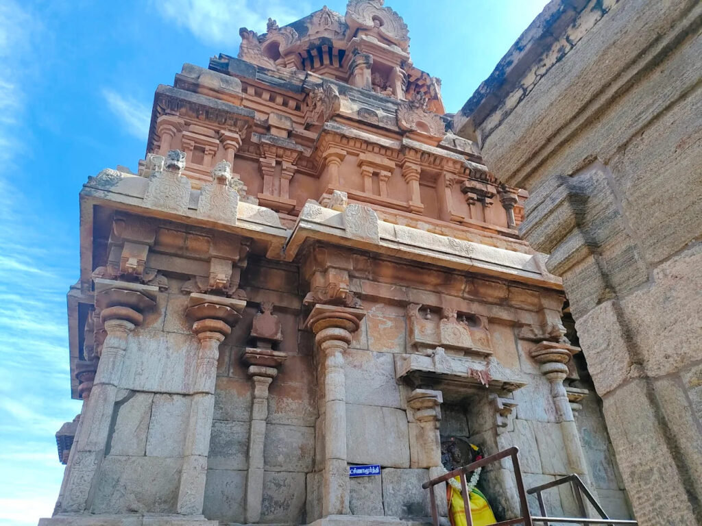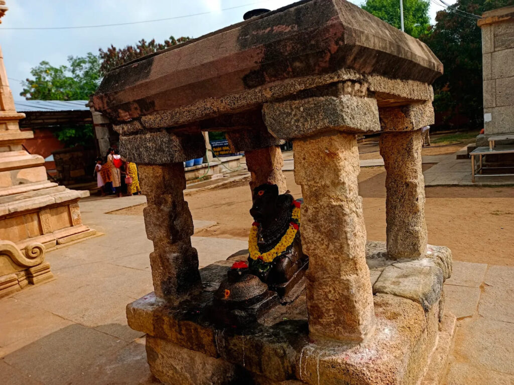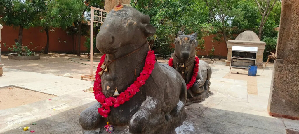 Architecturally, the temple faces east, with the Goddess facing south. A remarkable sculpture on the southern wall depicts a monkey in devotion, bowing before the lingam. Uniquely, the temple has two Nandhis in front of the sanctum. One Nandhi is earless, with a captivating story behind it—when a farmer accidentally injured the statue, blood emerged from it, and a family member of the farmer became mute. To seek forgiveness, another Nandhi was placed. However, as per divine command, the original Nandhi was restored, and the farmer’s family was relieved from the curse.