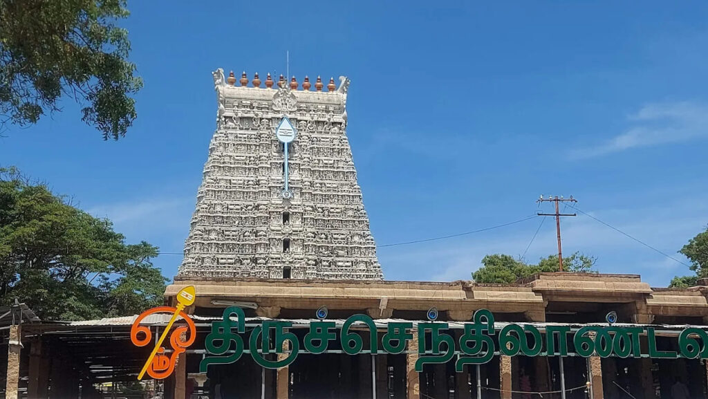 The Arulmigu Subramanya Swami Temple, located in Thiruchendur, Tamil Nadu, is one of the most revered temples dedicated to Lord Murugan (also known as Kartikeya). It holds the distinction of being the second of the Ārupadai Veedu (Six Abodes of Murugan). Positioned on the eastern edge of Thiruchendur town in the Thoothukudi district, the temple lies along the scenic shores of the Bay of Bengal, making it one of the few seaside temples in Tamil Nadu. It is situated approximately 40 km from Thoothukudi, 60 km southeast of Tirunelveli, and 75 km northeast of Kanyakumari.